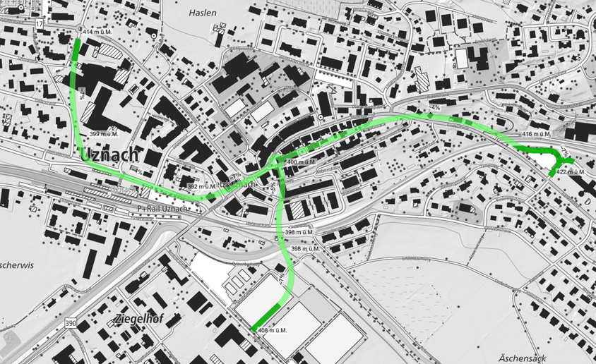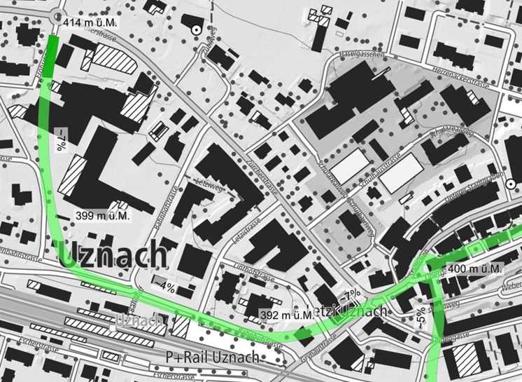 Die Tunnelzufahrt Tönierwies (dunkelgrün) befindet sich beim jetzigen Personalparkplatz des Spital Linth