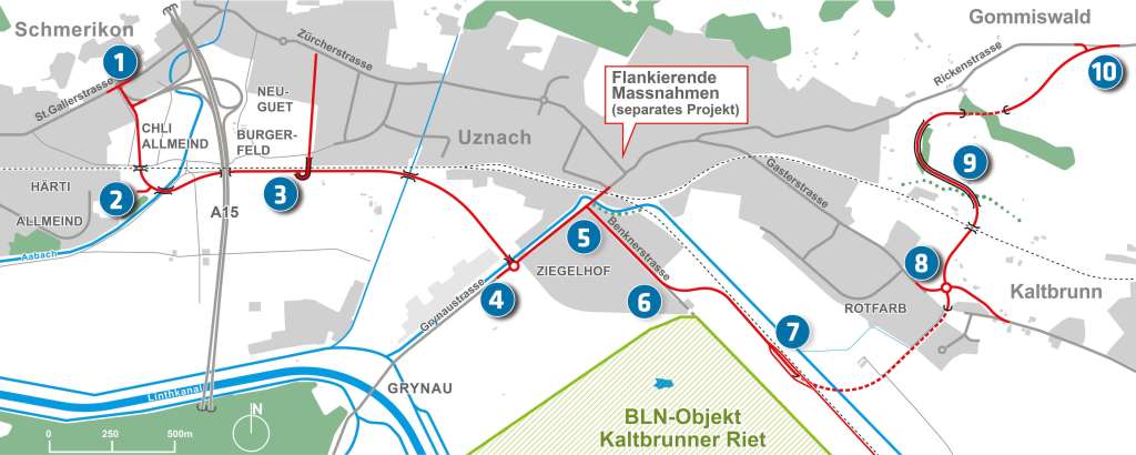 - Das Projekt ist keine «grossräumige Umfahrung», sondern eine Zange von 6 km Strasse im Süden und Osten der Wohngebiete von Uznach.